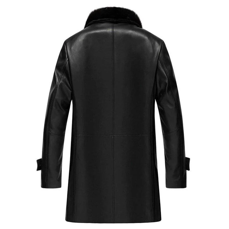 Mens Black Leather Shearling Coat ¾ Length Black Faux Fur Collar