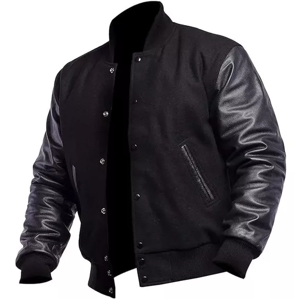 Whether you are an athlete or a fashion enthusiast, our black leather varsity jacket will always keep you in fashion. This jacket is manufactured with a wool body with leather sleeves and PU leather with soft insulation of polyester. The silver button-down closure on a black wool body with a standard ribbed collar makes it charming and eye-catching. It has two side pockets, two inside pockets, and long sleeves with ribbed cuffs that make it practical for everyday wear.