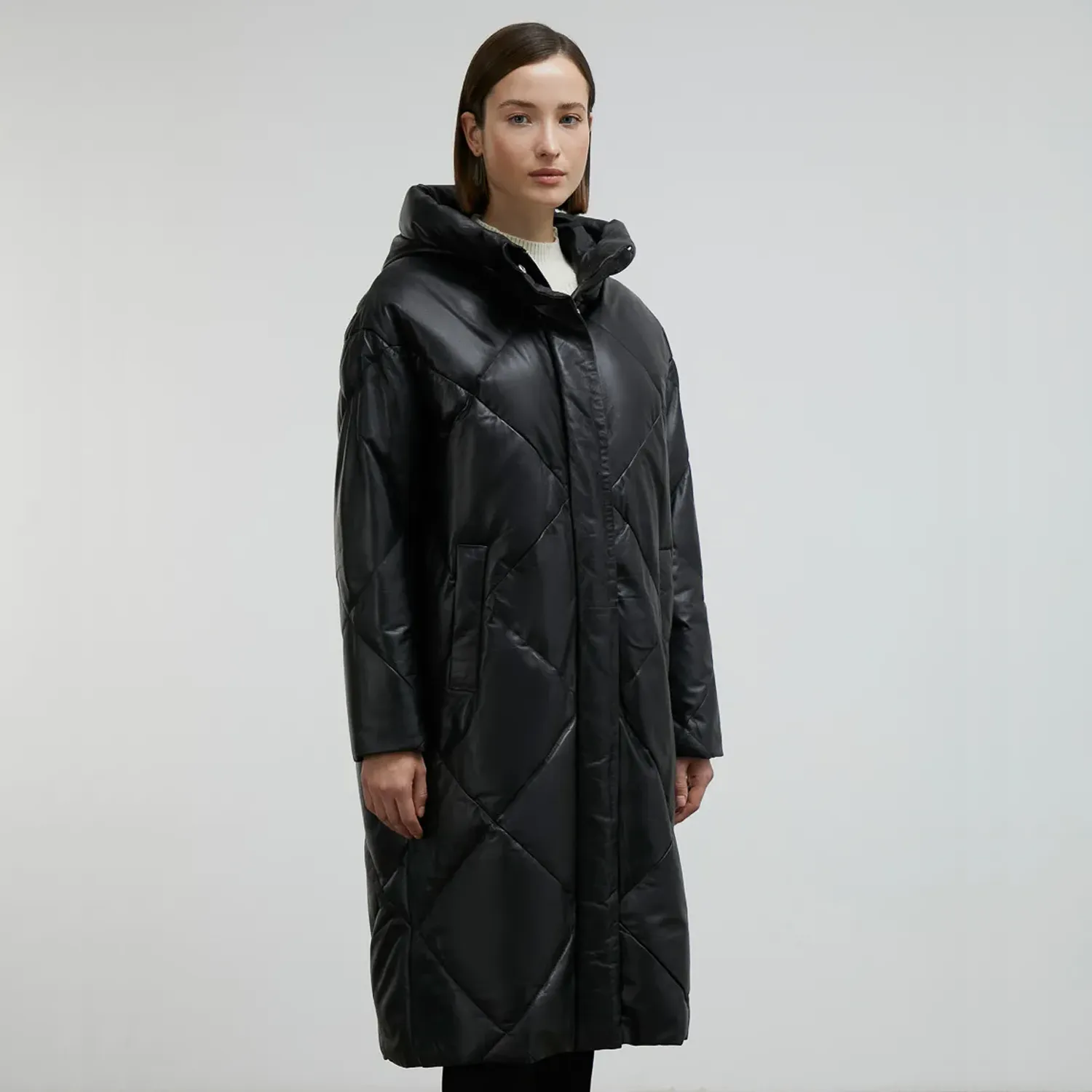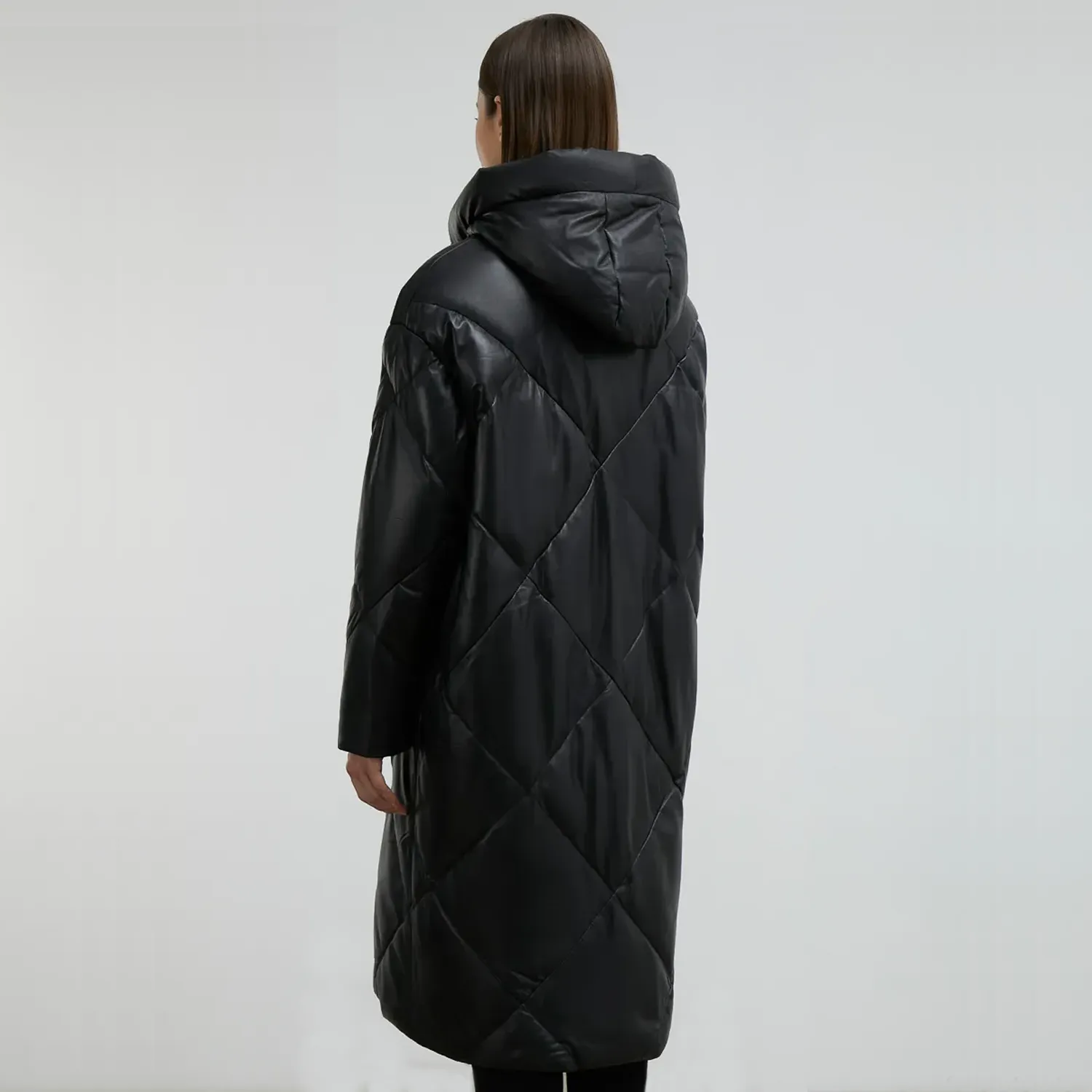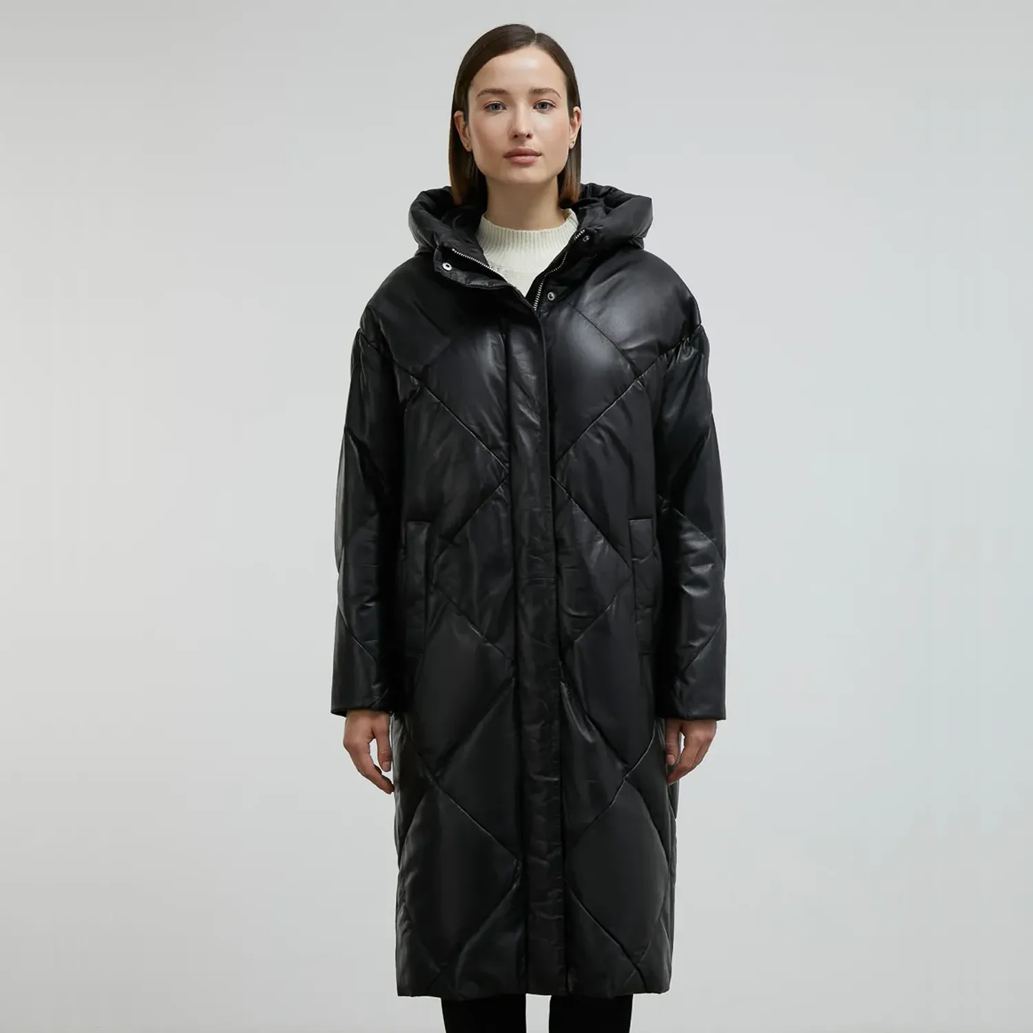Womens 7/8 Length Long Black Genuine Leather Fitch Quilted Puffer Coat