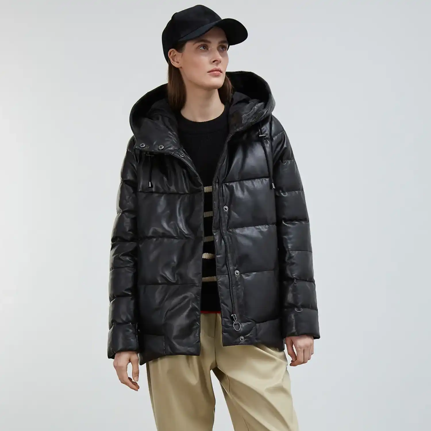 Wrap yourself in the soft padded fabric with this women’s black puffer jacket with hood. It is manufactured from lambskin or PU leather with polyester insulation that keeps you warm without feeling heavy. The soft, padded construction makes it perfect for everyday or outdoor adventures. It has a matching black hood that delivers a bright, modern look that pairs well with any outfit. The women’s black puffer jacket with hood has a stand collar and a polyester hood, providing extra warmth and protection. Its puffer stitching gives your body a voluminous look, while the front zipper closure makes it a secure fit. Its horizontal lining pattern adds a visual texture to your plain jacket, while the long sleeves keep your hand smooth and protected. The two sides and inside pocket have large spaces that make it easy to carry your things. Whether wearing it to seek protection or style it with your favorite pair of jeans, the ladies black puffer jacket with hood is a perfect combination of tradition and elegance.