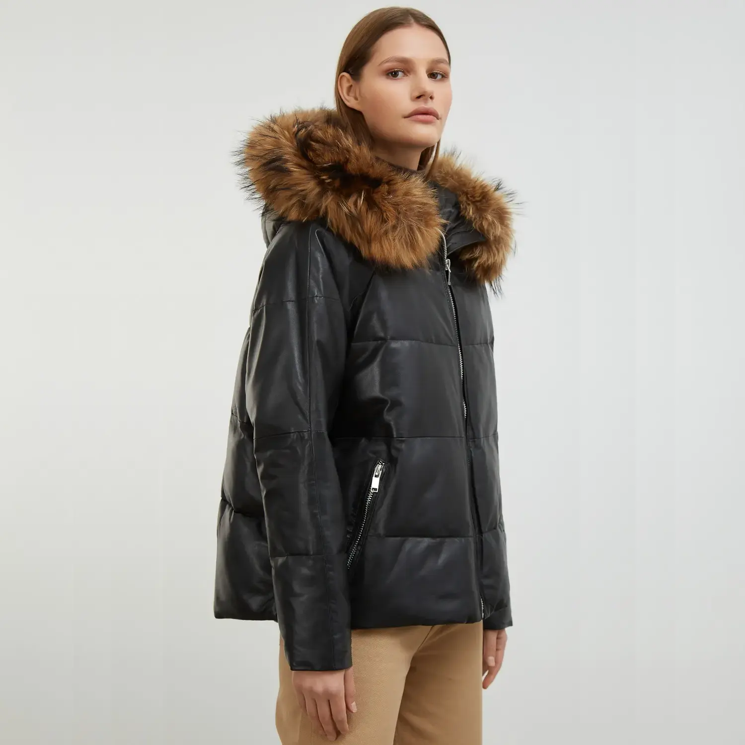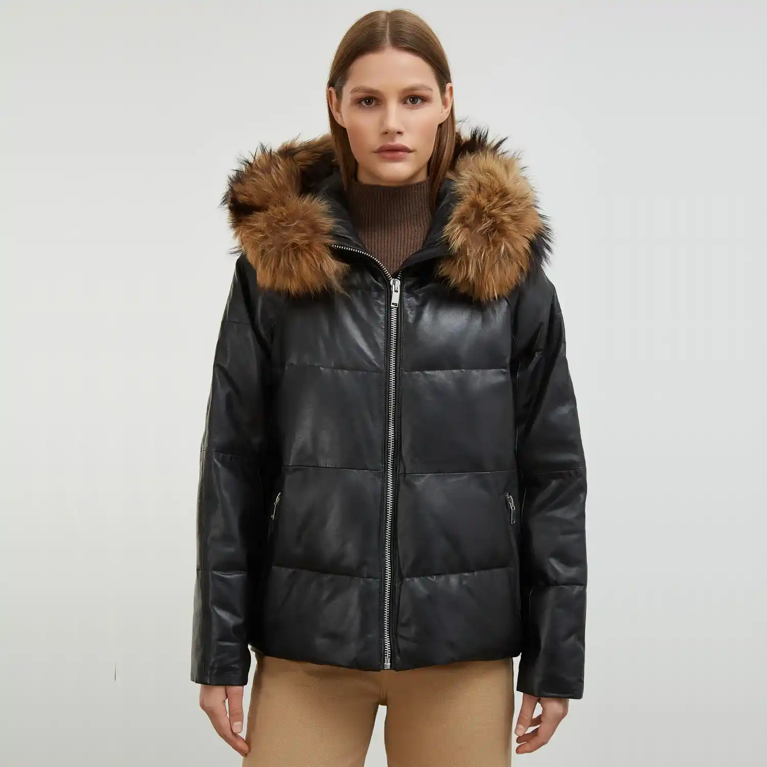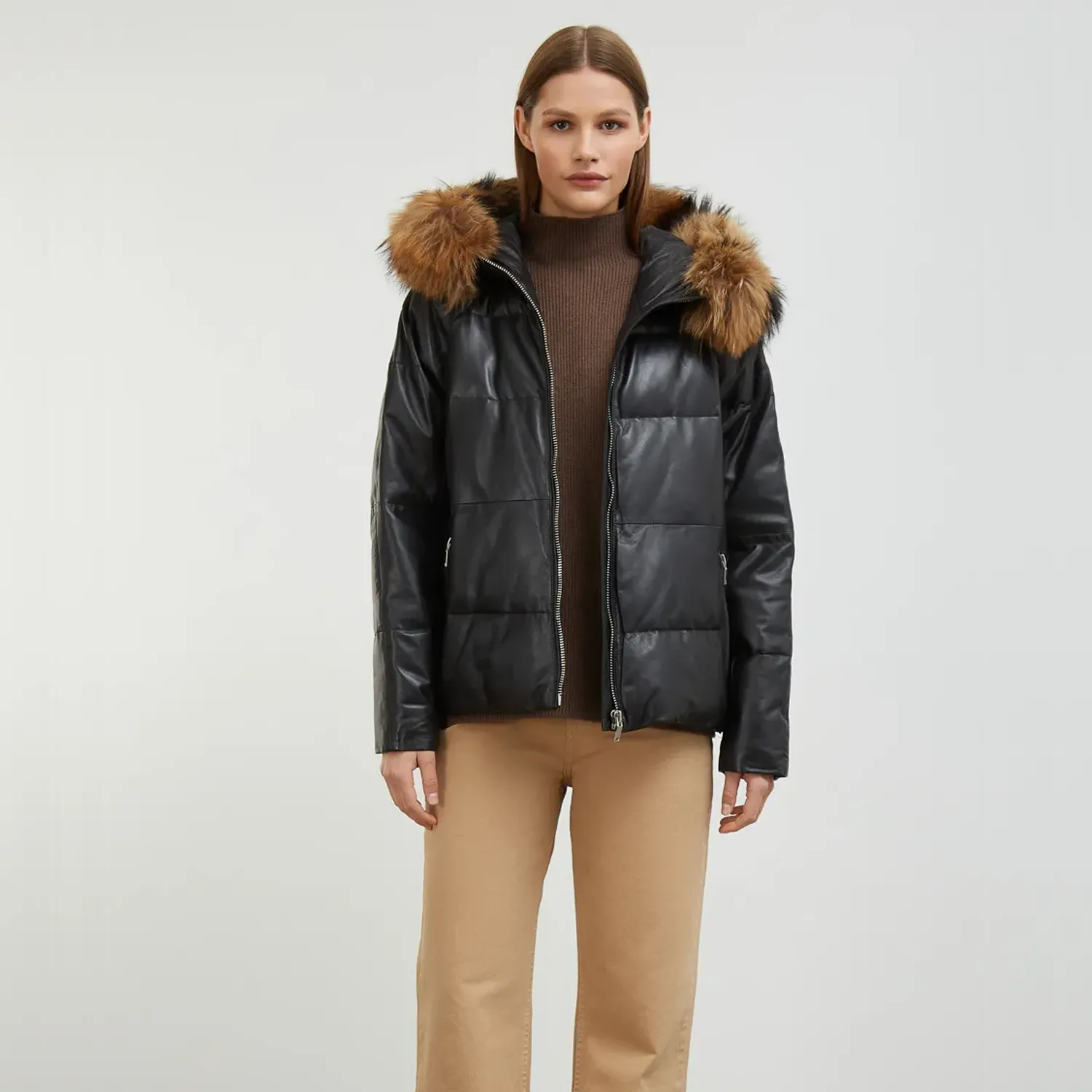 Have you ever seen the puffer perfection? If not, you must look at our black puffer jacket with fur. This jacket is made from soft lambskin or PU leather for durability, it has polyester insulation for protection against the cold weather. Its clean black finish makes it perfect for various outfits, while the luxurious brown furs at the collar add the luxurious charm for formal gatherings.