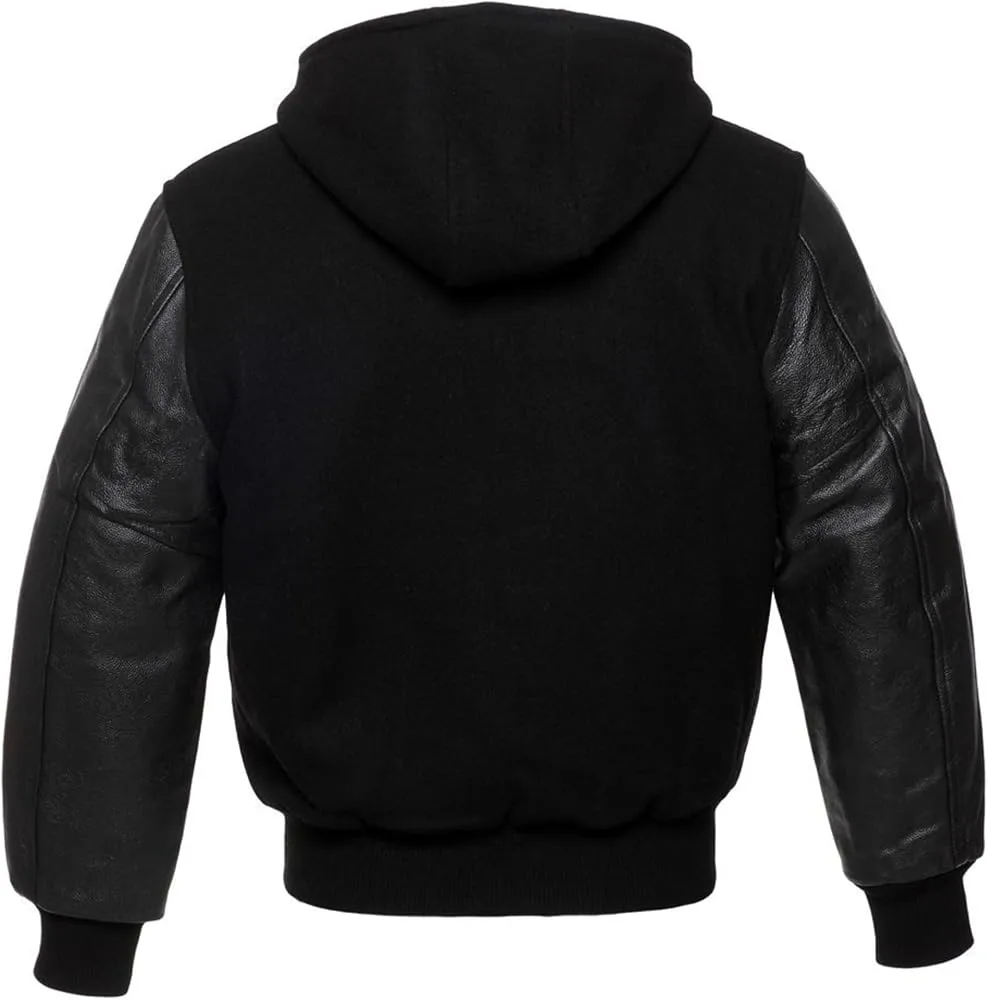 Black Varsity Jacket With Hood 98% Wool Fabric With Leather Sleeves