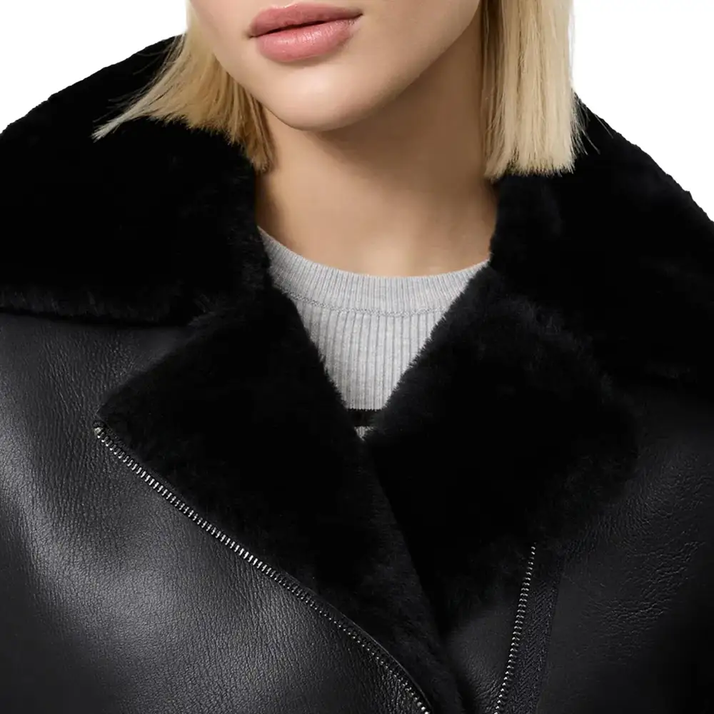 Black With Black Faux Fur Shearling Aviator Leather Jacket For Women’s