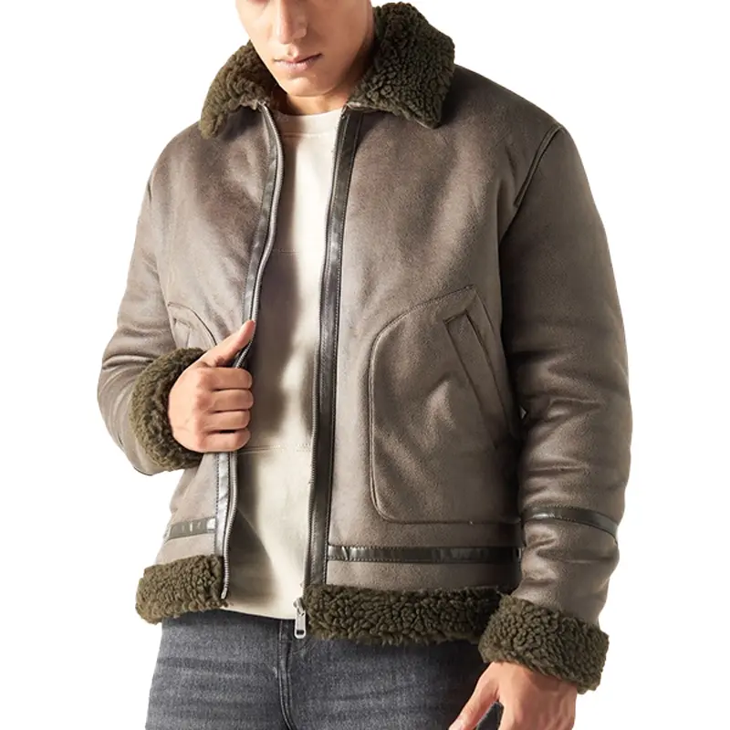 The mens bomber jacket with fur collar is made from lambskin or PU leather. It has a soft polyester lining with a brown vintage finish. The leather material makes it highly durable and resistant to cold weather. At the same time, the polyester lining adds the required protection and breathability for regulating body temperature.