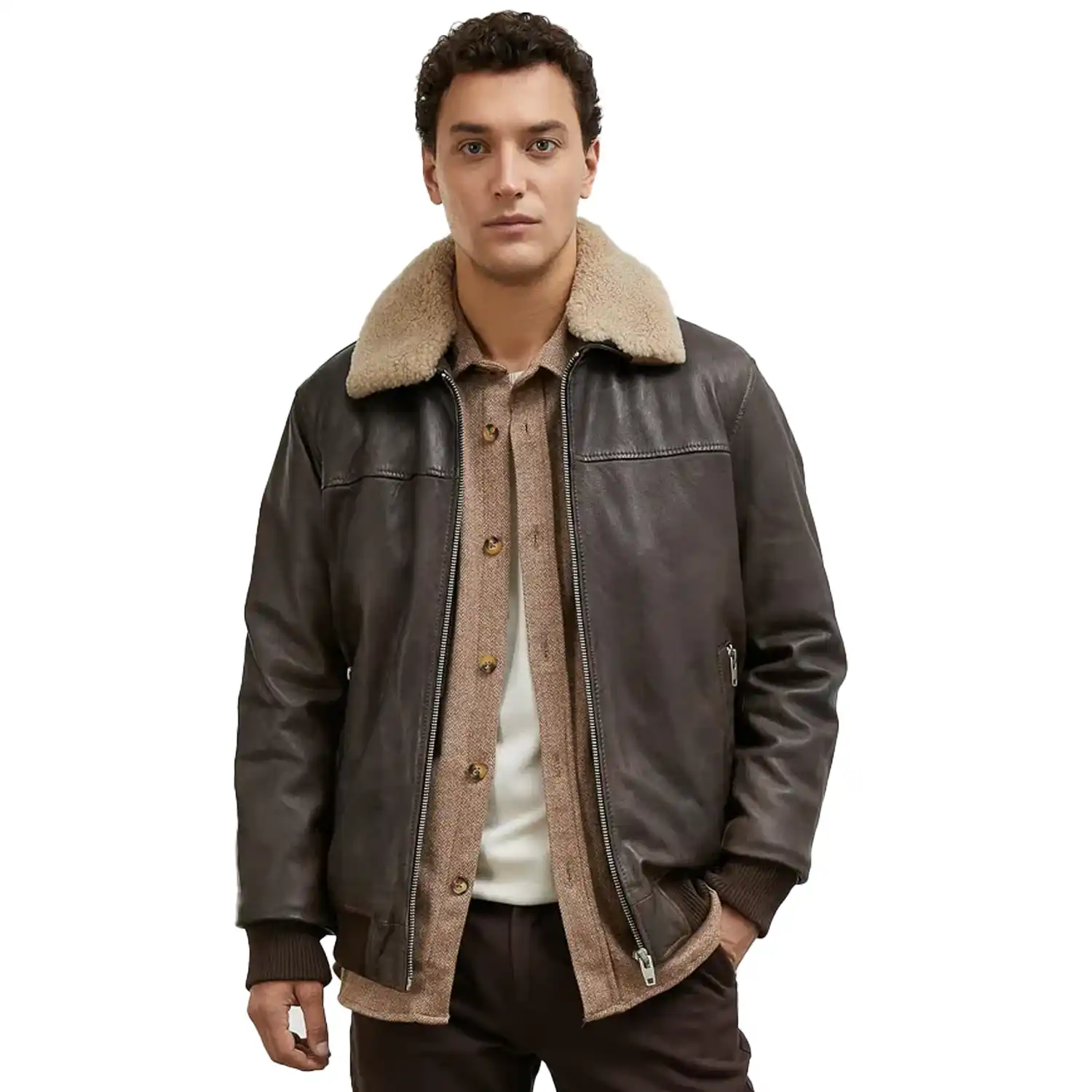 This mens brown leather jacket with fur collar pairs well with various outfits, including jeans, boots for a casual look, and wide-leg pants, a button-down shirt for a polished appearance. - Can I wear a mens brown leather jacket with fur collar year-round?