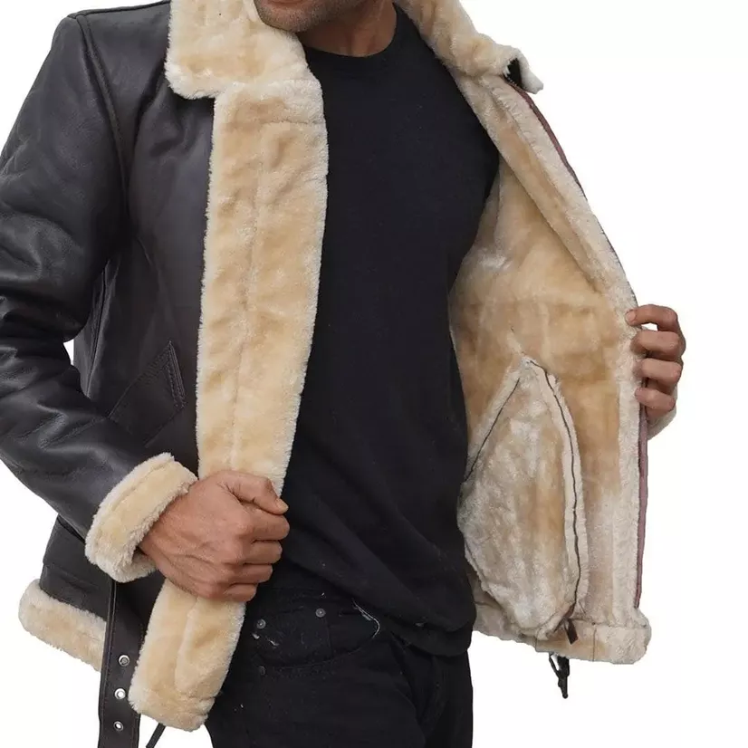 Step out confidently by owning the conventional style of a brown leather jacket with fur collar men’s. It is made from lambskin or PU leather, which makes it long-lasting to wear. Its soft polyester lining adds the right amount of comfort and warmth. This jacket has a front zipper closure that allows easy wearing, while the soft brown finish adds a polished look. The leather jacket has a stand collar with off-white furs to protect your neck on chilly nights. However, the hemline and cuffs with shearling add a fashionable touch to its powerful appearance. An extra brown belt slightly above the hemline complements its masculine structure. The mens brown leather jacket with fur collar is perfect for cherishing your bold personality without sacrificing comfort.