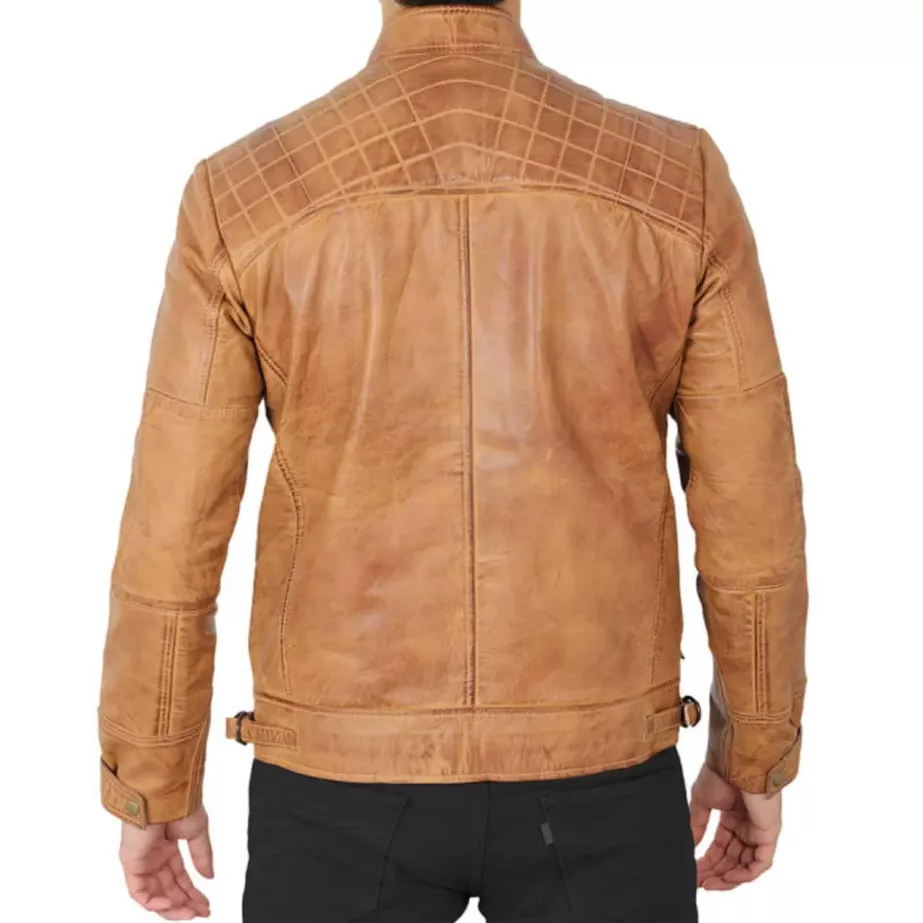 3. Winter Ready: Layer the camel leather jacket mens over a thick sweater, with jeans and insulated boots.