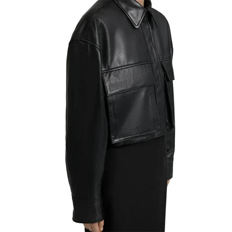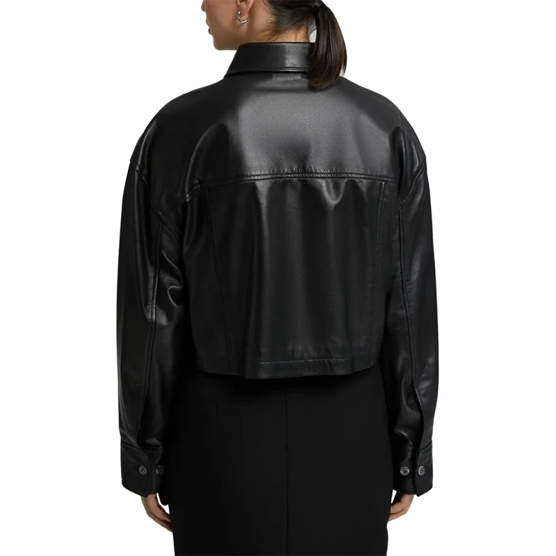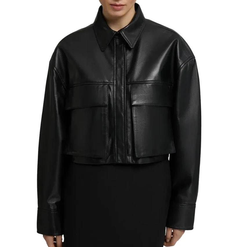 Conquer the world in style with our cropped leather jacket. Its standard shirt collar makes it versatile for any wardrobe. The large two-sided pockets add a radiating character to its minimalistic design. It has a front button closure, adds the convenience of easy wearing, and makes it perfect for layering. However, the cropped leather jacket womens has a cropped length for modern charm, while the black finish makes it a glamorous garment. It has long sleeves, extra protection, and one inside pocket to keep your stuff secure. Whether you style it for a girl’s day out or layer it over a turtle neck, this cropped black leather jacket will add a polished look to any outfit.
