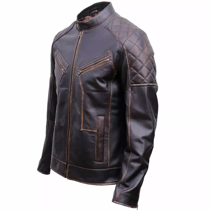 Men’s Cafe Racer Distressed Brown Quilted Leather Jacket