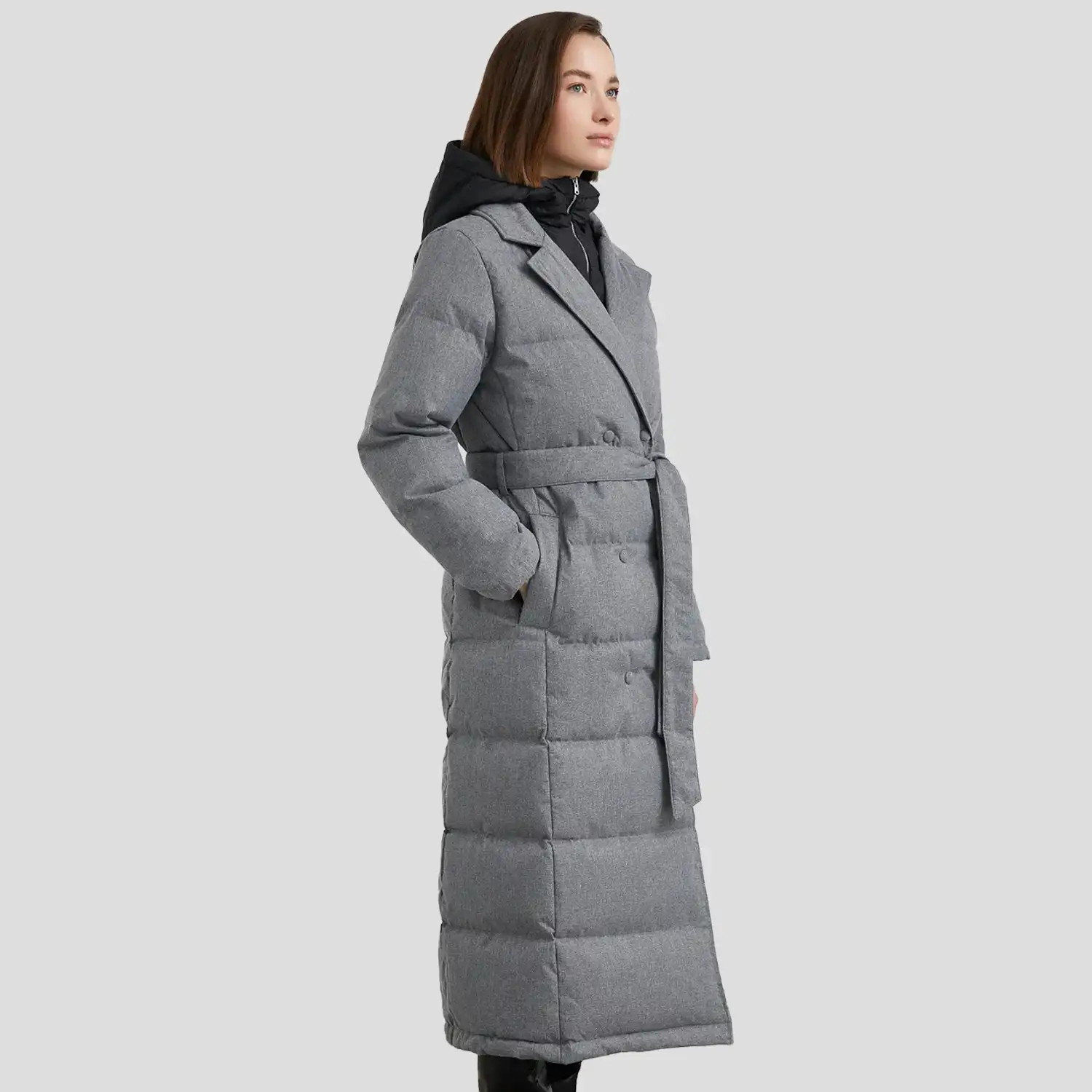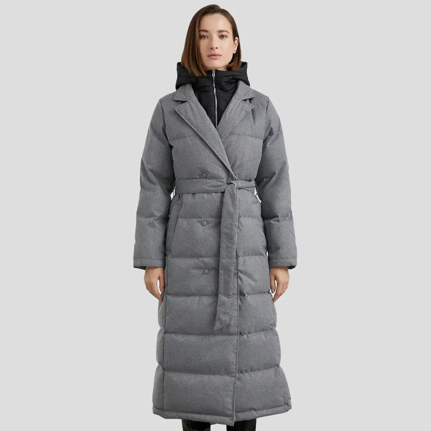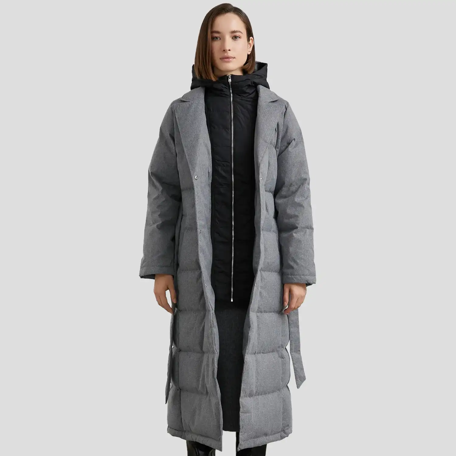 Womens Long Grey Puffer Coat Lapel Collar with Belt