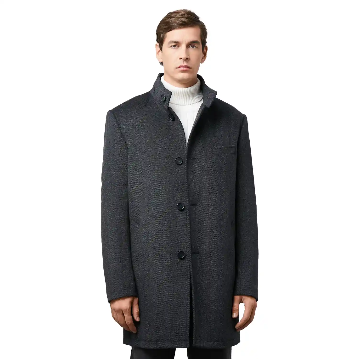 As the temperature drops, the mens grey coat wool becomes an essential part of a men’s wardrobe. It has stylish features that make it different from traditional coats. This coat has a stand collar with a snap button, which gives your neck a tall appearance. The button-down closure with three black buttons allows easy wearing and multiple stylings. A wool coat mens grey has a rough greyish finish to create an old-fashioned charm. Apart from this, it has long sleeves and various pockets, such as two side pockets, one chest pocket, and one inside pocket, for practicality. Moreover, you can style the grey wool coat mens for any casual to semi-formal look due to its versatile colour palette.