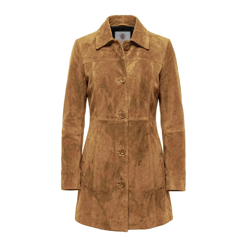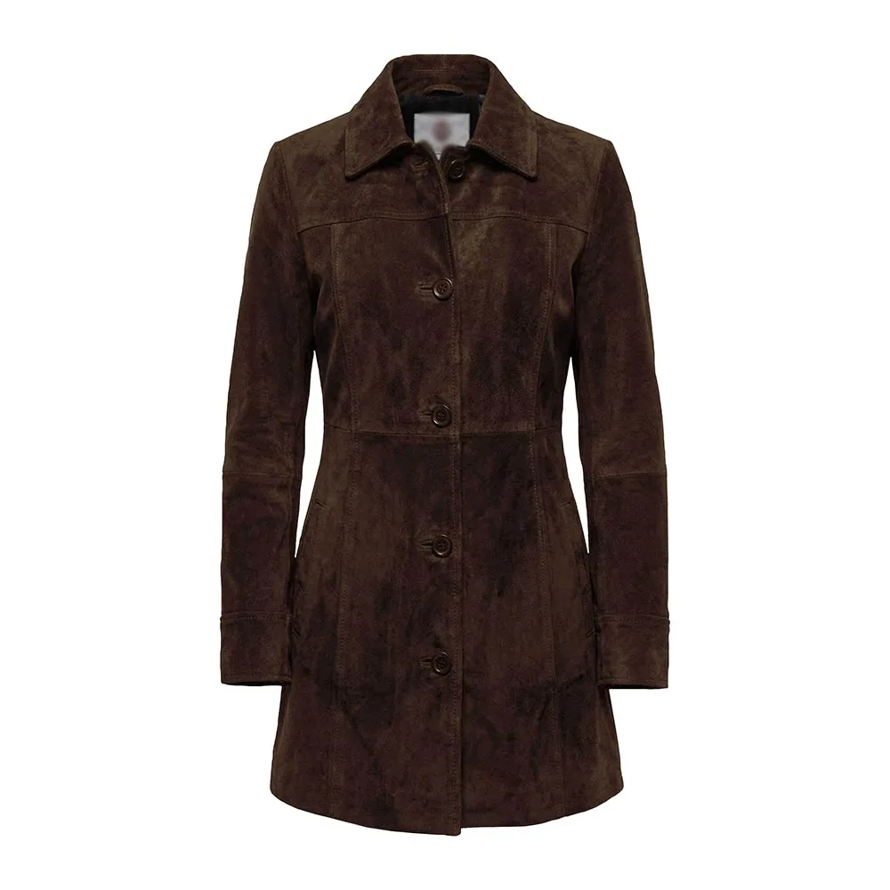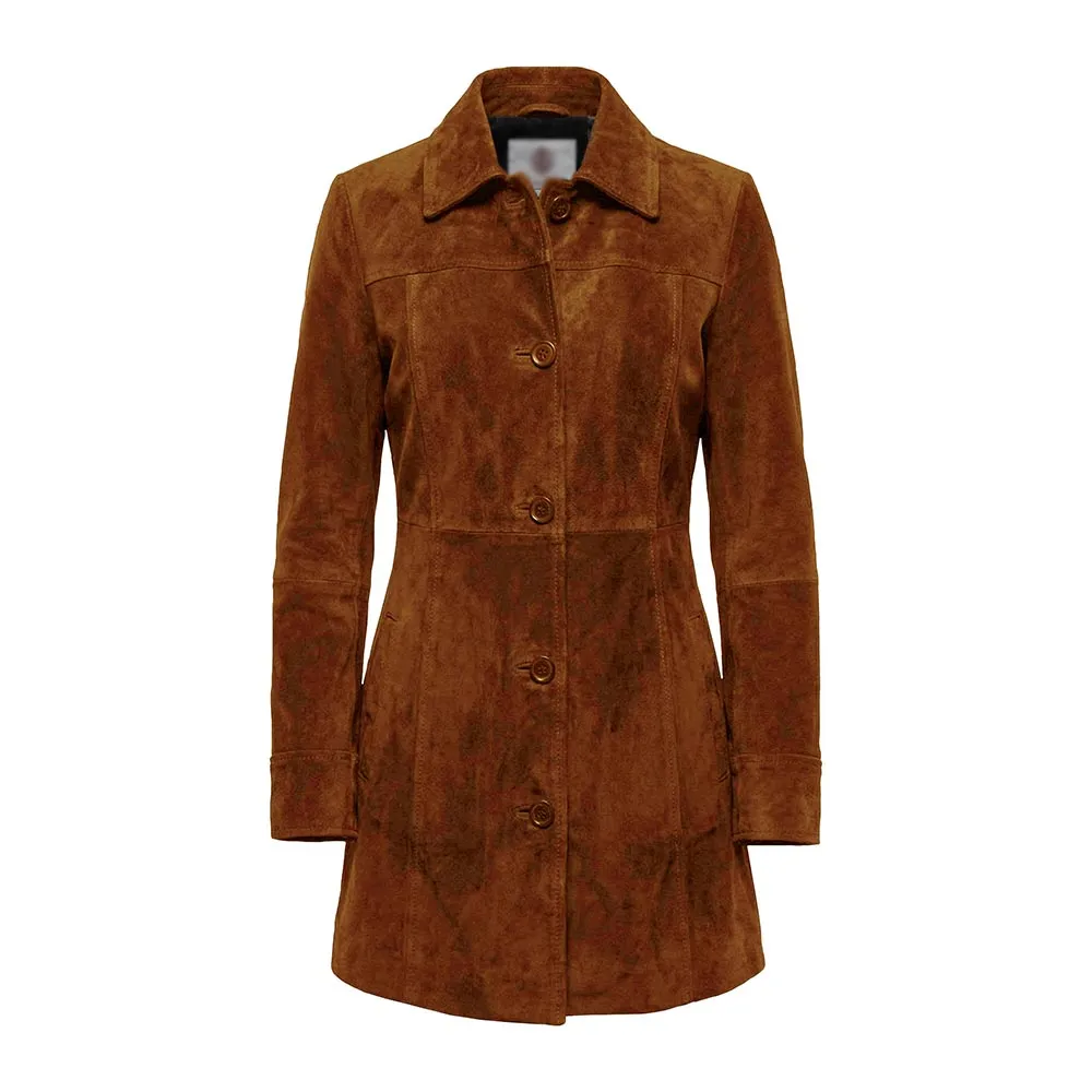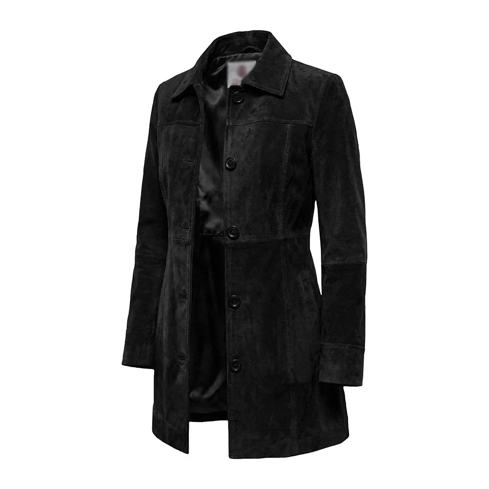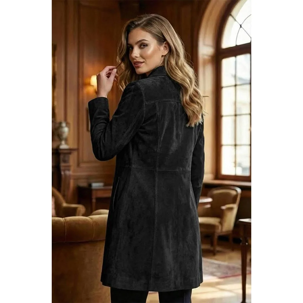The essence of this Kandis Women’s Black Suede Car Coat For Sale is comfort and wearability. Moreover, its smooth viscose lining is so soft to touch against the skin, and you can easily layer it over tops, sweaters or dresses. The buttoned front closure ensures a tailored appearance and a secure fit. Furthermore, its straight-cut design gives your body a slim, flattering look. Long sleeves offer complete coverage and protect your hands from the cold. The open-hem cuffs will add an easy-going yet sophisticated touch. The element of practicality is thoughtfully addressed with two open-style outer pockets where one can keep their daily goods. You can also keep your hands warm during long walks. An inner pocket is present to keep valuable things. Overall, this coat is functional, durable and stylish.