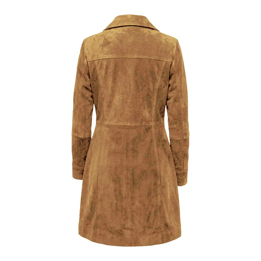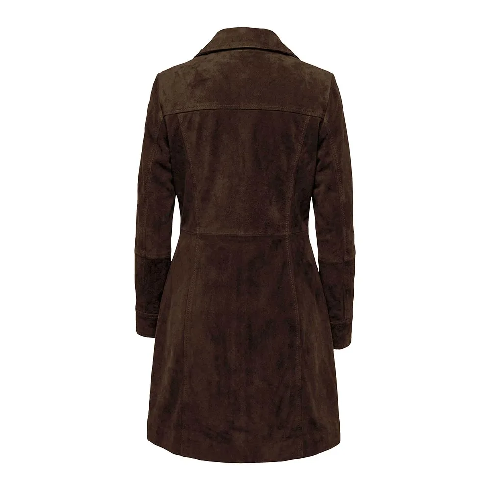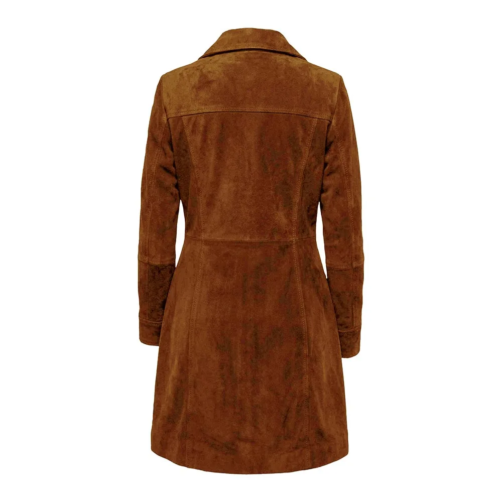 The difference between the Kandis Black Suede Car Coat and any other item is its luxurious, high-end appearance. First, let’s talk about its top-notch material. Its suede exterior offers high-end insulation and breathability. Therefore, it is appropriate for the transition seasons and colder days without weighing your shoulders down. However, it is highly durable but prone to staining and water damage. Therefore, if you are wearing it during snowfall or rainy days, make sure to use a water repellent spray. It is available in Black, Brown, Dark Brown and Tan Brown. You can choose the darker shade for a sophisticated, versatile look. In addition, opt for a lighter shade for an elegant, refined appearance. It is an excellent choice for women seeking a durable, elegant and versatile outerwear staple that complements many looks and occasions.