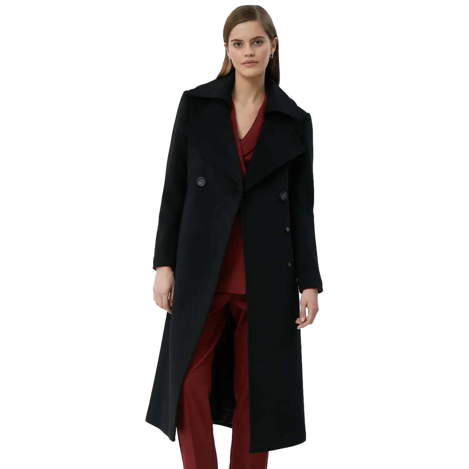 Ladies Black Belted Long Double Breasted Wool Coat Lapel Collar