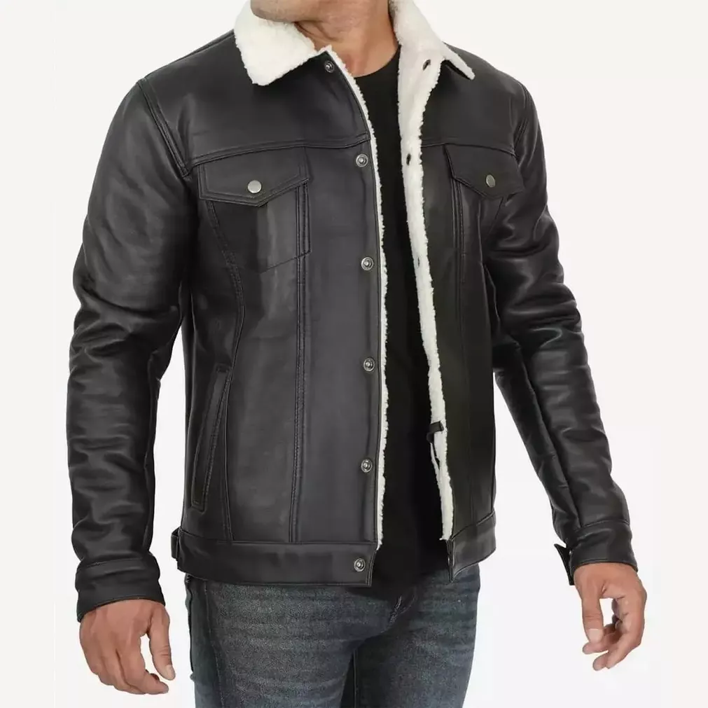 Black Leather Sherpa-Lined Trucker Style With Faux Fur Collar Jacket