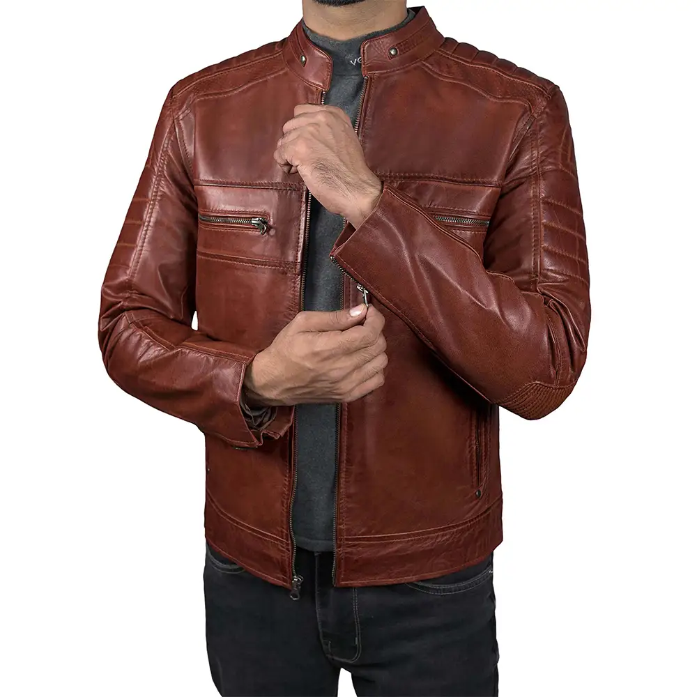 Now, let’s discuss the material of this Lambskin Leather Cafe Racer Jacket. The quality of Lambskin leather is unique in terms of its softness, flexibility, and classiness. It is not heavy like the heavier hides, but it is lightweight. Meanwhile, it has a high level of durability. Therefore, it is ideal for structured jackets like a cafe racer. Moreover, it is crack-resistant with long maintenance, and it gains a great character with care, making it more appealing to the eye. The breathability nature of lambskin, coupled with the viscose lining, regulates the temperature and offers overall better wearability. Even though the lambskin leather is tough, it is important to note that it tends to stain more easily and be scratched. Always remember to remove the stains with lukewarm water. The jacket is not only an outerwear item but also an investment in style, confidence, and the biker legacy.