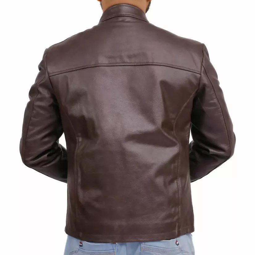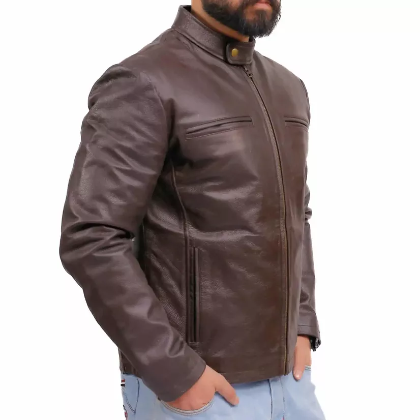 Make your wardrobe stylish and versatile by adding our Mens Real Leather Biker Jacket. This jacket is the most demanding article of this season due to its vintage appearance. The mens real leather jacket is manufactured with genuine PU leather and has a soft polyester lining for comfort. Apart from its durable leather material, this brown leather racer jacket has a premium front zipper closure with smart pocket details. Its two side pockets, two chest pockets, and one inside pocket provide ample storage for your stuff. From formal gatherings to casual days, the stand collar with a snip of this mens brown leather moto jacket will keep you tall and fashionable in any event.