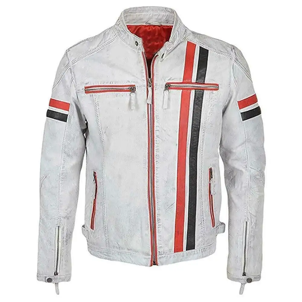 Premium VN1 White Leather Jacket with Red and Black Racing Stripes For Men’s