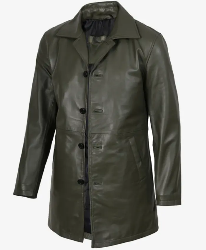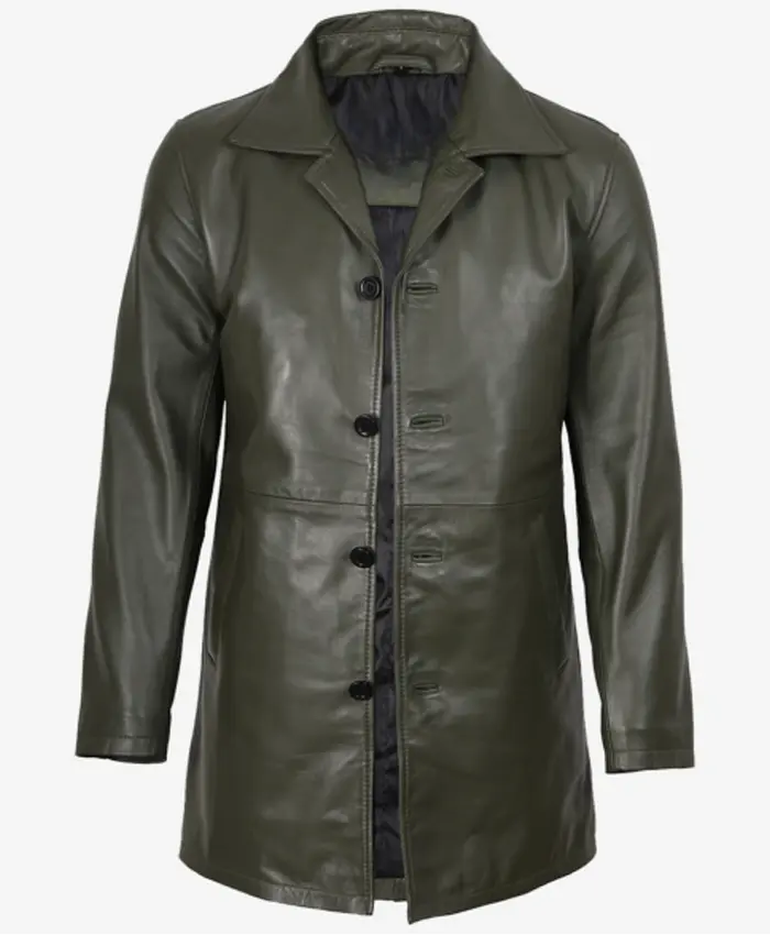 Men’s 3/4 Length Olive Green Leather Coat showcases versatile appeal, designed for modern wardrobes. The olive green shade pairs well with trousers, denim, or winter outfits. Therefore, your every look will be classy and effortless. In addition, the mid-length cut is a good complement to both formal and relaxed clothes. The notch lapel collar also works well for office wear as well as for evening events. It is a single coat that serves multiple purposes confidently. In the meantime, open hem cuffs are comfortable because they do not cause any restrictive pressure. Its high-quality leather is also low-maintenance, and it ages gracefully. Consequently, its ownership will feel rewarding, economical, and practical. This leather car coat is a wonderful investment, as it is not only functional but also durable and versatile, with timeless appeal. You can find it easily in our functional and stylish Men Coats collection.