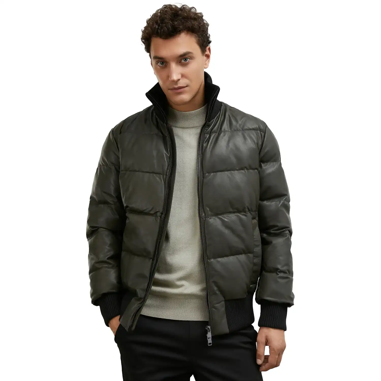 Experience the luxury of leather with a pop of colour by adding an Olive Green Puffer Jacket to your everyday style. This jacket is available in lambskin or PU leather with soft polyester insulation to add a soft touch to your skin. The front zipper closure makes it easy to wear, and the stand collar makes your neck long and structured. The Olive Green Puffer Jacket has large two side pockets and two inside pockets that provide ample storage for your essential stuff like mobile, wallet and keys. Whether you’re heading out for a casual day or an evening adventure, this versatile olive green puffer jacket men promises to keep you stylish and comfortable.