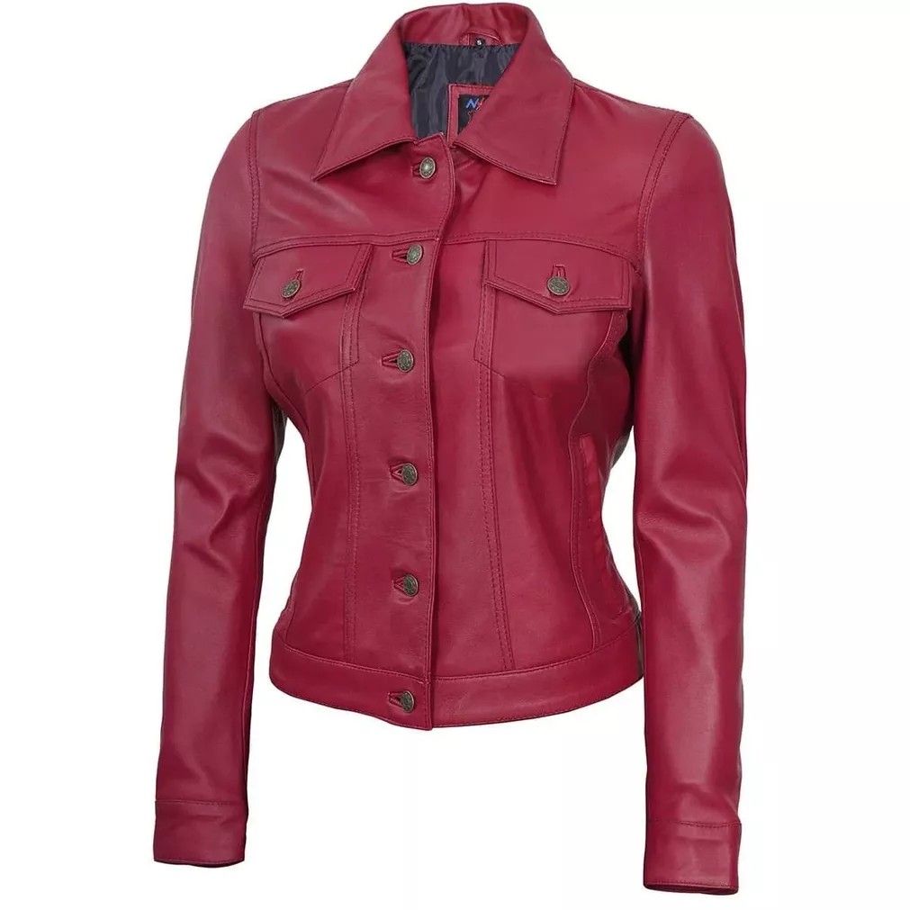 Make your style bold and vibrant by adding our Pink Leather Trucker Jacket. This pink leather jacket is perfect to add a feminine look in your wardrobe. It is made with lambskin or PU leather to ensure long term durability. Its soft polyester linings protect your body against the harshness of cold weather. The button-down closure and two chest pockets with silver buttons add a visual texture. Its standard shirt collar makes it a relaxed fit jacket. The long sleeves add a touch of warmth and comfort without compromising on style. It has two side pockets and one inside pocket that allow you to keep your essentials. The Pink Leather Trucker Jacket is perfect for girls day out, casual days and semi-formal events. It can effortlessly make your any outfit look extra-ordinary with its vibrant color.