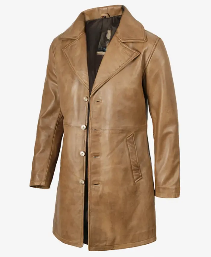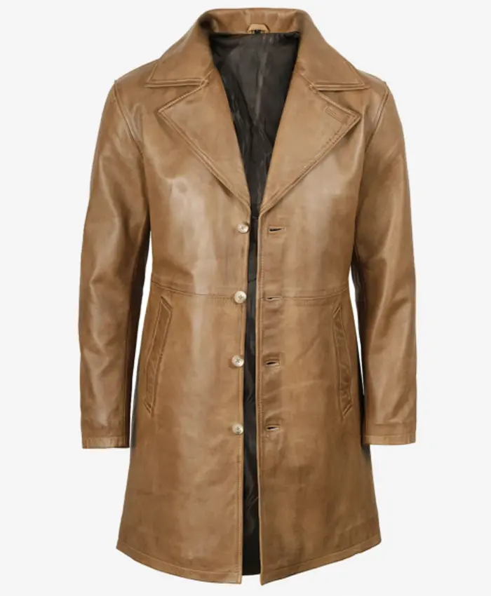 The Real 3/4 Length Camel Brown Leather Coat expresses warmth, balance, and traditional elegance. In addition, the real leather construction provides stable strength that can withstand frequent wear. Also, the camel-brown color adds natural richness that immediately softens striking appearances. Thus, the coat is inviting and not overwhelming. In addition, the mid-length cut offers additional coverage without sacrificing the ease of movement. As a result, the commuting process and outdoor activities become more comfortable. The wide notch lapel collar elegantly frames the chest. This coat automatically elevates posture and confidence. However, soft viscose lining enhances air circulation, which makes it less stiff and more comfortable. All in all, this coat is a blend of sturdiness and approachable sophistication, making it a reliable everyday companion.