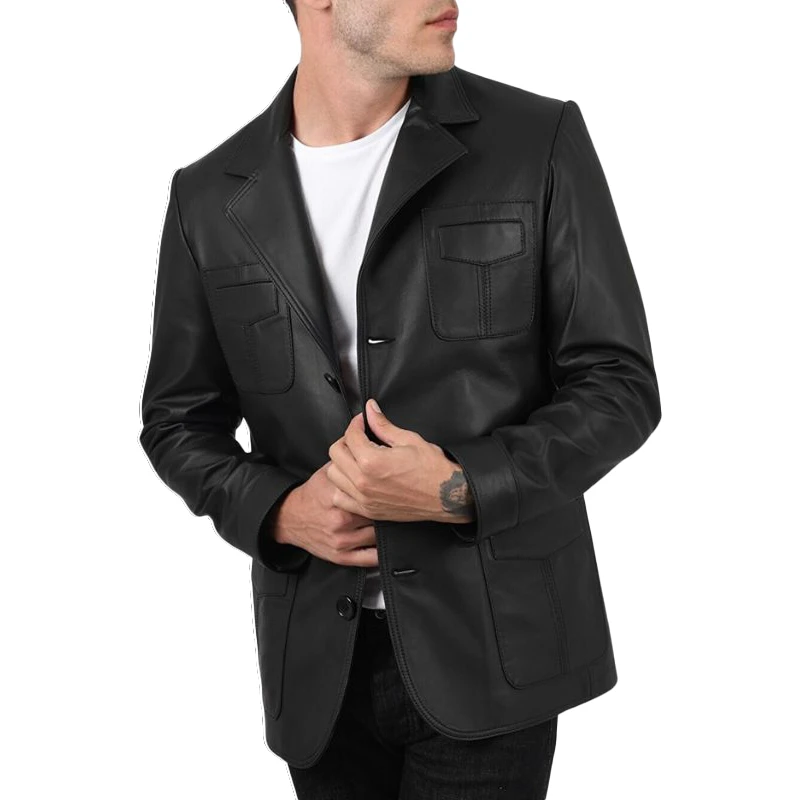 The black mens leather blazer is thoughtfully designed to push your fashion boundaries. It is made from lambskin or PU leather to ensure durability and affordability. Meanwhile, the soft polyester lining will regulate your body temperature to prevent overheating. This blazer has a clean black finish that can complement any outfit, whether jeans, t-shirt, dress pants, or button-down shirts. Black Mens Leather Blazer has a stand collar with wide notch lapels for a defined presence, while the v-shaped neckline provides a relaxing fit.