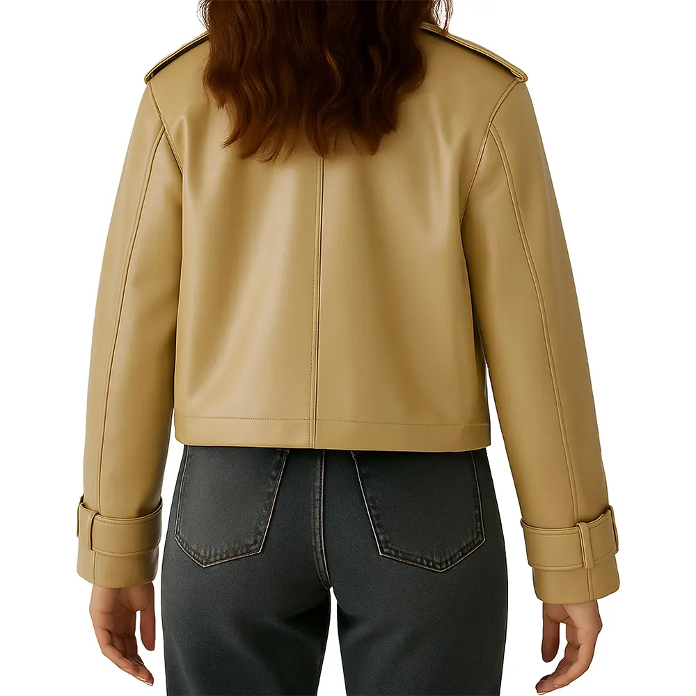 Women’s Short Trench Coat Style Jacket For Sale prioritizes everyday practicality without losing elegance.  To begin with, there are multiple spacious pockets that hold your essentials without ruining the jacket’s smooth appearance. The leather construction is also very effective against light weather and wind. Therefore, the jacket works well in the transitional seasons. In addition, belted cuffs help control sleeve fit while adding style flexibility. Hence, comfort remains the same over a long wear. Moreover, the cropped length allows easy movement, especially during busy routines. Consequently, it is ideal for commuting, outings, and night plans. Moreover, black colour gives it a traditional look. However, beige color makes it suitable for different wardrobe moods. This jacket is a perfect combination of class, functionality, and style.  It offers durability, adaptability, practicality, and modern trench elegance that instantly catches everyone’s attention wherever you go.