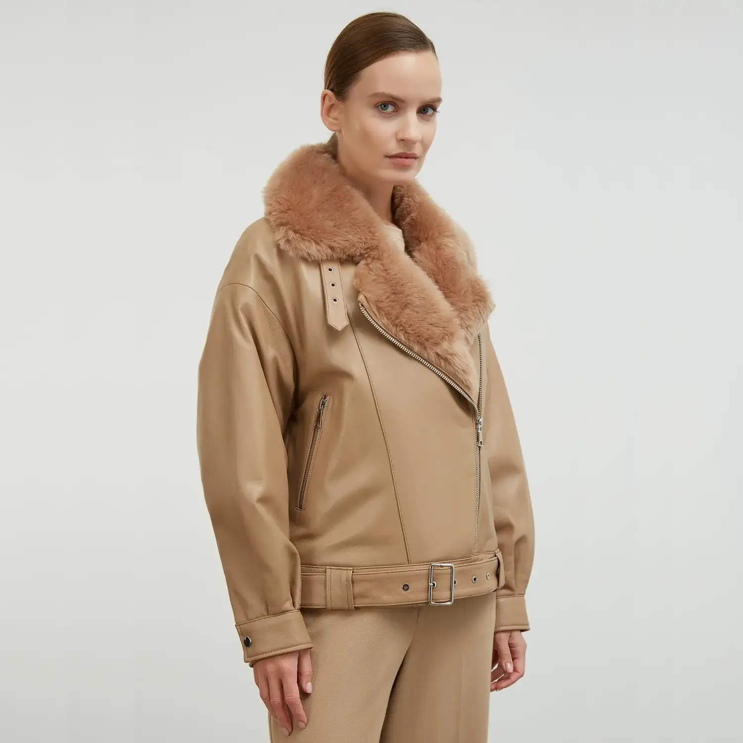 The tan fur jacket with an asymmetrical zipper takes inspiration from the early 20th century and is designed for practicality and style. The asymmetrical zipper popularized by the 1928 Schott Perfecto, provided easy wearing and better wind protection. In recent years, faux fur has been adopted as an alternative to animal fur, blending warmth and style.