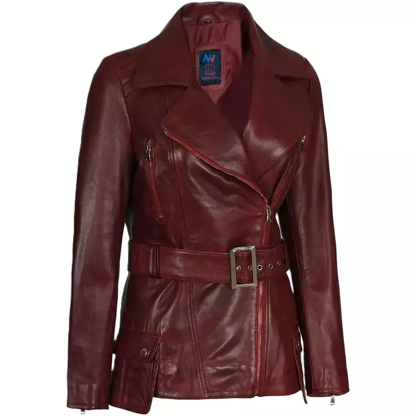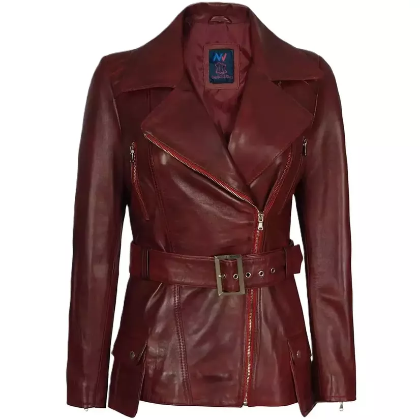 This vintage burgundy leather jacket holds an everlasting style. Made from soft lambskin and PU leather, it offers a luxurious feel and a classic vintage style. The asymmetric front zipper closure and lapel collar make it more refined. This jacket features two side pockets & one chest pocket and a comfortable polyester lining, women’s maroon leather jacket is both stylish and functional. Whether you’re going out or staying in this vintage leather jacket is a multifunctional piece that takes your outfit to the next level.