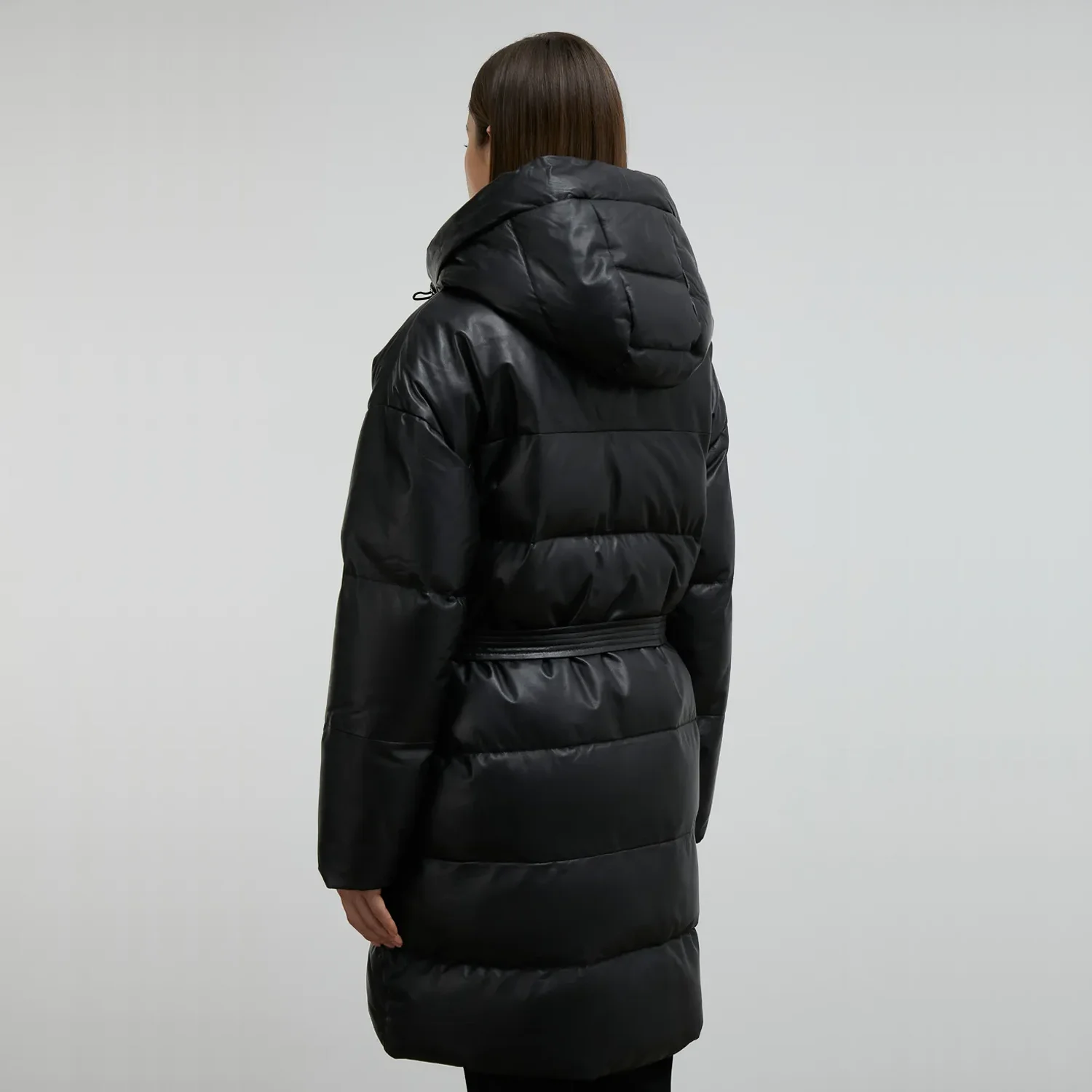 Women Black Long Puffer Coat With Hood And Belt