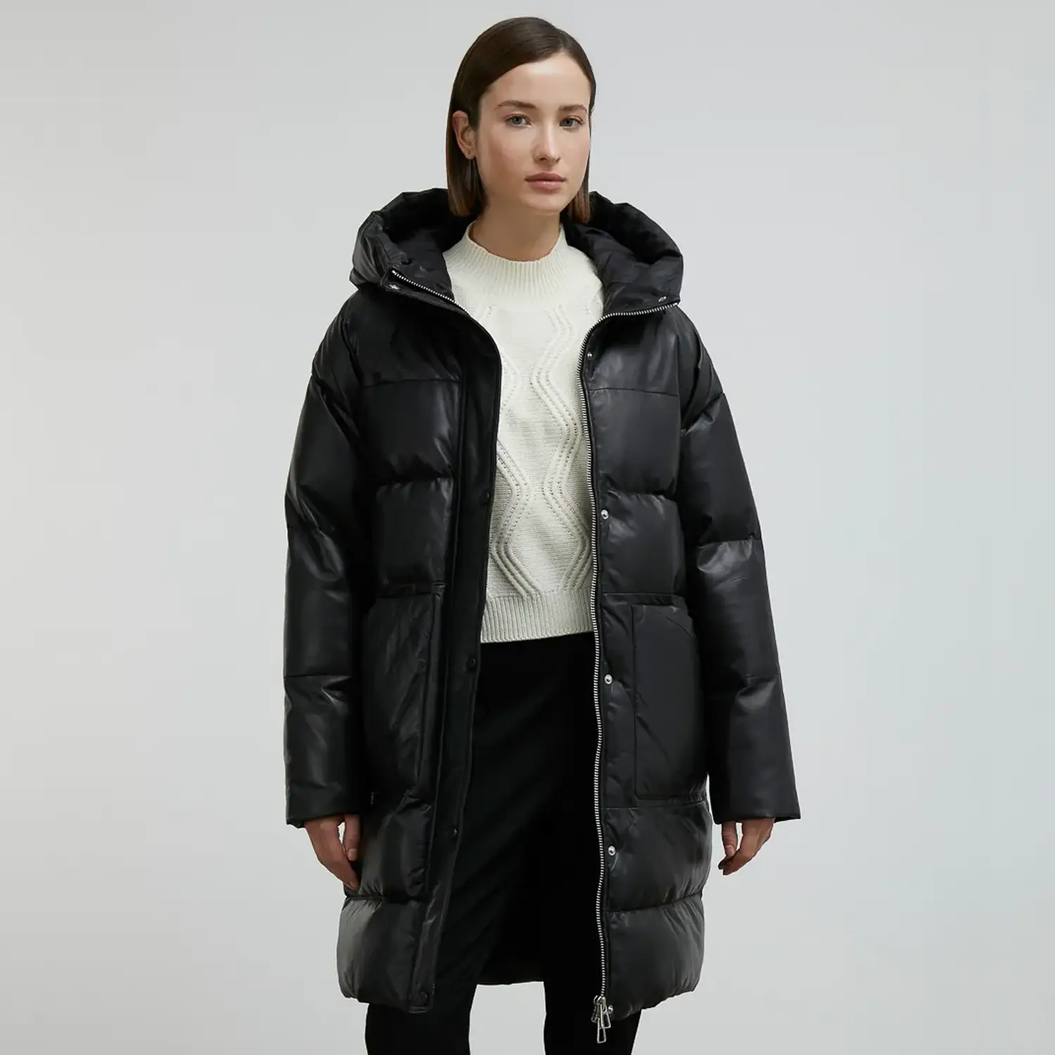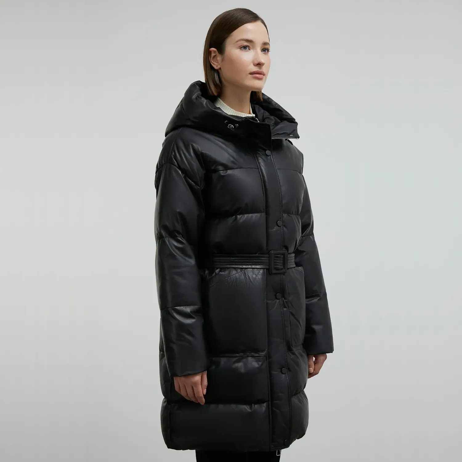 Add a traditional touch to your wardrobe with our newest women’s black long puffer coat. This coat is manufactured from lambskin or PU leather with a soft polyester lining. The leather exterior makes it wind-resistant and resistant to wear and tear. Meanwhile, the polyester lining protects your body against snowfall and cold temperatures. Its puffer construction makes it lightweight with extreme thermal properties. The women’s black long puffer coat has a stand collar with a polyester hood that keeps your neck and head warm and comfortable. Its front button closure makes it easy to wear, while an extra belt with a plastic square ring adds security and style. Moreover, it has two side pockets to keep your hands warm and one inside pocket for everyday essentials. From casual everyday wear and friend’s hangout to any outdoor adventure, this women’s black puffer coat with hood will always make you look stylish.