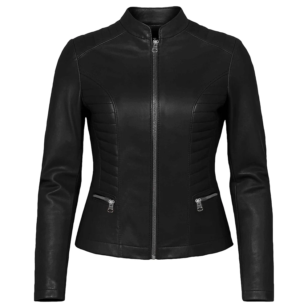 The city wakes slowly, engines are running softly, and assurance is easy as one gets out of the house in the Women’s Cafe Racer Leather Jacket. Crafted with clean lines and a padded front to provide a sleek, streamlined look that feels strong without being loud. Moreover, real leather provides natural durability, preventing cold wind from entering. At the same time, it is flexible enough to move and wear every day. As you zip it up, the upright collar frames your appearance with sharp precision. Therefore, even your simplest outfit feels elevated. In the meantime, long sleeves provide balanced coverage, making this jacket suitable for the transitional seasons. If you desire a jacket that can work during the day and at night, strikes a balance between the edge and the elegance, and is fashionable season after season, this cafe racer offers all these features.