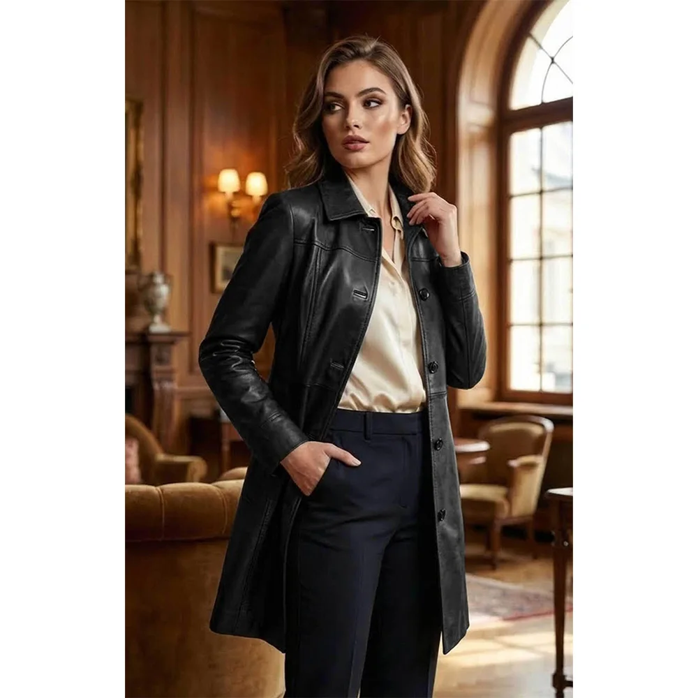 Womens Real Leather Car Coat opens like a quiet ride on a cool afternoon, windows partly down, and the road stretching ahead without urgency. The coat belongs to those days when you wear something that is stylish and comfortable, when you get out of the house or the car, chilled, confident, and with an ease of dressing. In addition, its middle length form allows free-flowing movement and does not pull one down. The coat has smooth, real leather, which gives it a classy feel rather than a trendy one. You can carry it while running city errands, long drives, or peaceful evening walks. It forms an emotional bond rooted in comfort, maturity, and subtle luxury. This coat is from our expressive Women’s Coats & Dusters collection. We have it in both dark and light colour options to suit every individual’s taste.