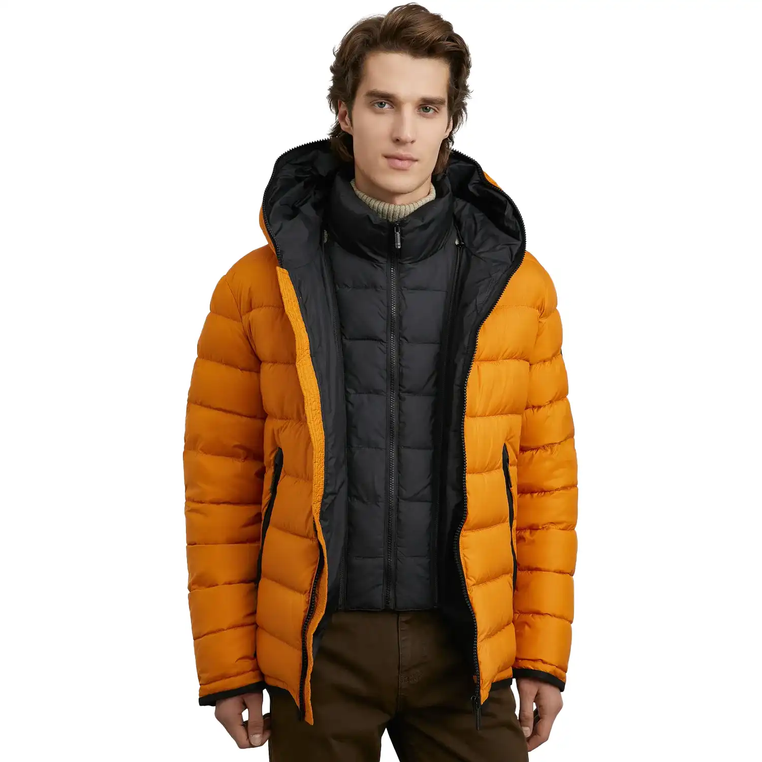 Our yellow puffer jacket is a vibrant winter dream for every man. Its soft polyester lining keeps your body protected on chilly nights and breathable on slightly warm days. The front zipper closure in black creates an exciting contrast with the orangish-yellow body. Meanwhile, the two side pockets with a black finish add a visually pleasing touch. Its stand collar with a hood gives your head and neck the right support, comfort, and protection. You can detach the hood according to your styling preference. Its puffery appearance makes your upper body look voluminous and notable, while an inside pocket provides space for your mobile, wallet, and keys. Whether you dress up without a hood for a formal occasion or dress down for additional warmth, the yellow puffer jacket with hood will always make your every look unique and impressive.